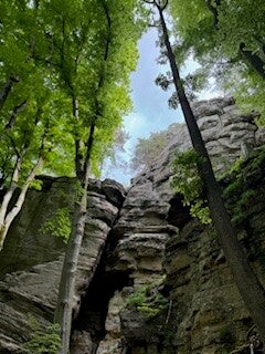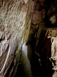Je begint met lopen vanaf de parkeerplaats, en eigenlijk kom je al heel snel in het bos. Alles is supergoed aangelegd, overal vind je trappetjes, railingen en wegwijzers. Als eerste kom je langs het Raiberhiel, oftewel het Rovershol. Hier kun je via meerdere kanten in. Wij zijn hier niet in geweest omdat het superdonker en smal was. Omdat je een kind in een rugdrager + draagzak hebt, ben je in de smalle spleet ook niet mobiel. We pasten er dus echt niet in.